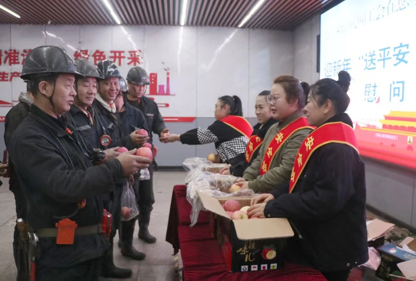 一句句暖心问候、一声声恳切叮嘱、一个个象征平安的苹果,承载着矿工会的关怀与矿工家属的殷切期盼。职工们接过“平安果”,咬下香甜的果肉,脸上洋溢着幸福的笑容,内心的暖流驱散了冬日的寒意。大家深切感受到组织与家庭的双重牵挂,纷纷表示将以实际行动回馈这份关爱,以饱满的精神状态、昂扬的奋斗姿态投身矿井安全生产工作,严格遵守煤矿安全规程,上标准岗、干标准活,用责任与担当守护矿井平安,为新一年的安全生产开好局、起好步。
